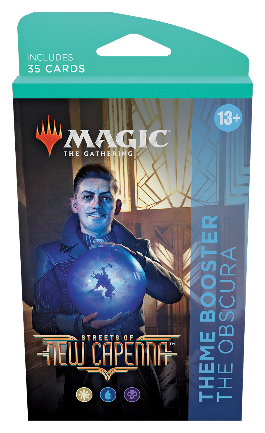 The Obscura Streets of New Capenna Theme Booster (White-Blue-Black) contains 35 cards, with a combination of 1–2 cards of rarity Rare or higher (2 in 10% of packs) and 33–34 Uncommon and/or Common cards.